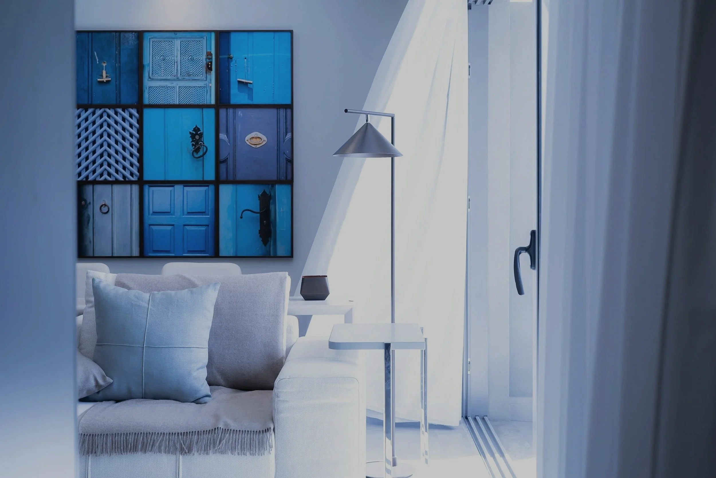 Sicht auf eine moderne, helle Wohnzimmer-Ecke mit weißem Sofa, Stehlampe, kleinen Tisch und Wandkunst aus blauen Tür- und Fensterdesigns.